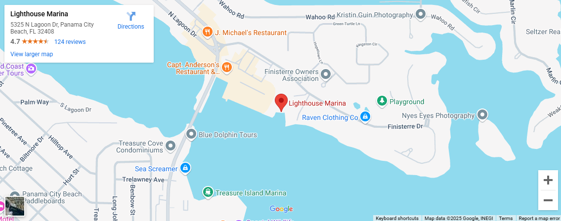 Lighthouse Marina is located on world famous Panama City Beach, Florida along the north shore of Grand Lagoon, a protected body of water connected to the Gulf of Mexico by West Pass, just minutes by boat from the marina.